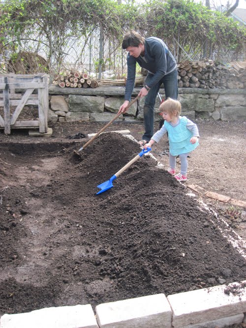 Papa and baby Syl have been prepping our back yard garden and pouring over the Baker's Creek Heirloom seed catalog. It's good to see them working together now. Two years old is a good age to start the chores.